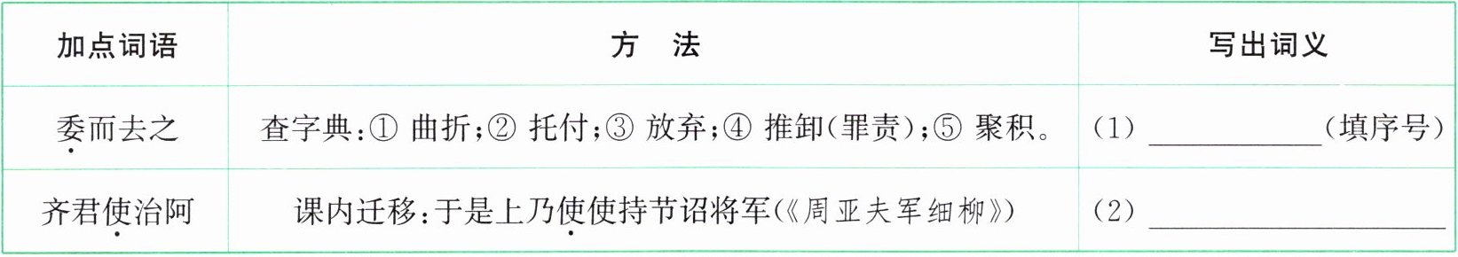 使持节诏将军(《周亚夫军细柳》)|(2)______|2. 把下列句子翻译成现代汉语。