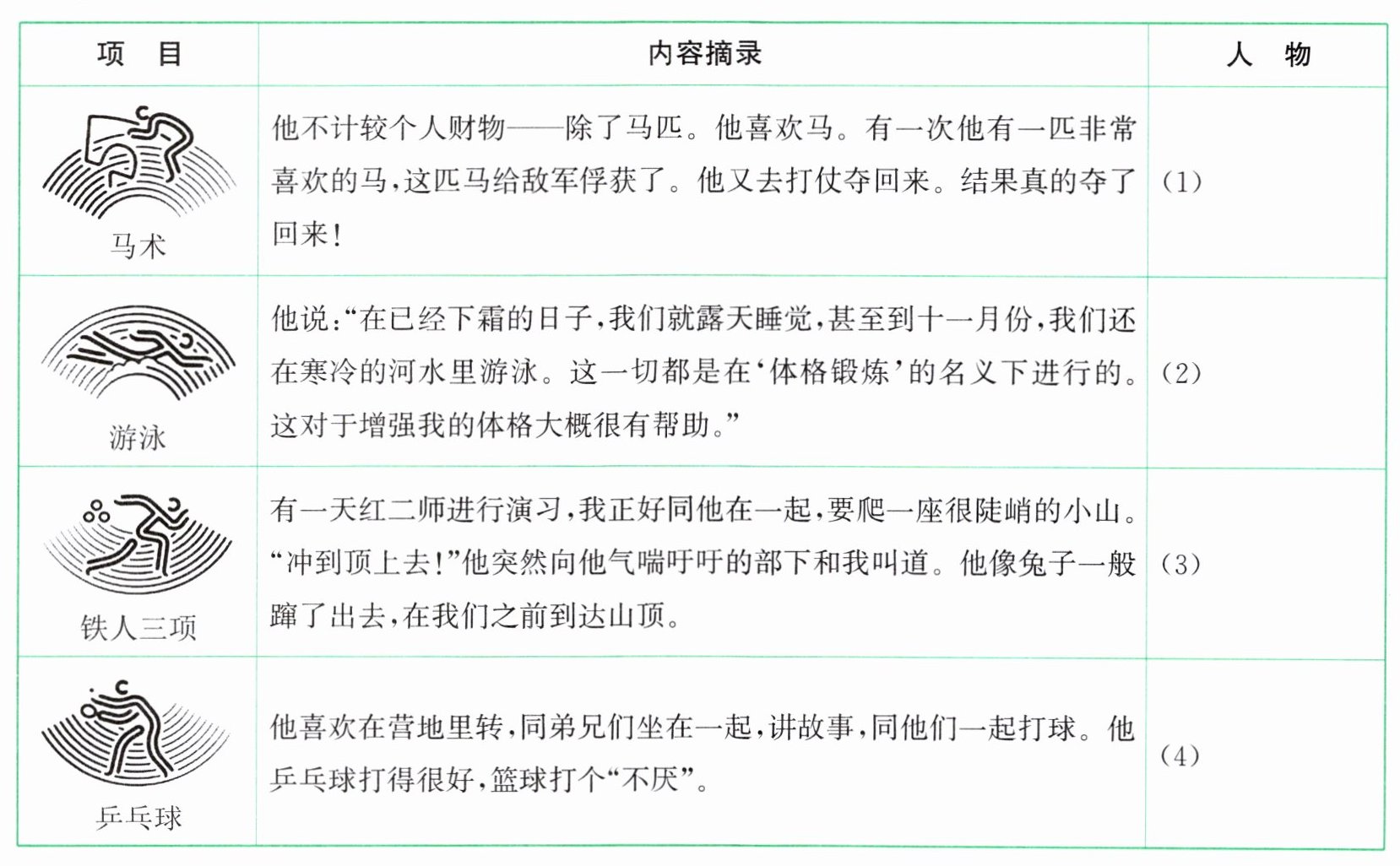 |乒乓球|他喜欢在营地里转,同弟兄们坐在一起,讲故事,同他们一起打球。他乒乓球打得很好,篮球打个“不厌”。|(4)______|