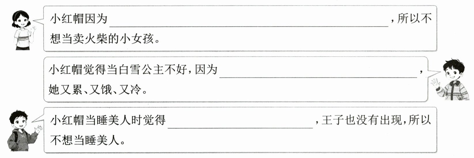 3. 阅读童话故事后,三位同学展开了讨论。请根据故事内容,将他们的对话补充完整。(3分)