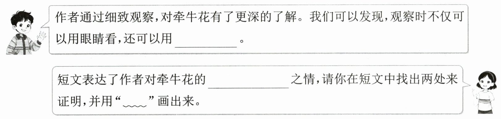 1. 牵牛花生命力顽强 牵牛花很神奇(每空1分) 2. 心形 绿色 像美丽的“小喇叭” 红的、蓝的、紫的 淡淡的清香(每空1分) 3. B C A(每空1分) 解析:结合文中的句子“十几天后,牵牛花从土里钻出了嫩芽,长出几片心形叶子”“到了八月份,牵牛花的长藤上长出一串串花骨朵儿”“深秋,牵牛花的叶子也枯了”可知答案。 4. 示例:饥饿 整整齐齐地排好队 摇着花枝望着(每空1分)(评分建议:仿照画“ ”的句子描写,得2分;想象表达合理,得1分。) 5. 示例:鼻子闻 喜爱(每空1分) 每天放学,我都会去看看它们长高了没有。 牵牛花每天早上都会吹起小喇叭,叫醒我;伤心时,它们就会翩翩起舞,陪伴我;每次取得好成绩时,它们就会吹起欢迎曲,祝贺我。(每处1分)