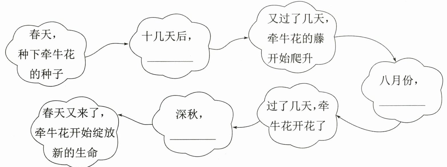 ③ 我想种牵牛花,说干就干。在妈妈的帮助下,春天我在墙角边种了几颗牵牛花的种子,静静地等待着它们长大。十几天后,牵牛花从土里钻出了嫩芽,长出几片心形叶子。牵牛花刚长出来的叶子是绿色的,而且绿得很。又过了几天,牵牛花的藤攀着竹竿缓缓爬升。每天放学,我都会去看看它们长高了没有。到了八月份,牵牛花的长藤上长出一串串花骨朵儿,慢慢地,花骨朵儿饱胀起来。过了几天,牵牛花绽放出几朵花儿,有红的、蓝的、紫的,就像美丽的“小喇叭”。凑近一闻,一股淡淡的清香扑鼻而来。小蝴蝶、小蜜蜂也来凑热闹,在花间翩翩起舞。深秋,牵牛花的叶子也枯了。严冬过去了,春天又来了,它们就会破土而出,开始绽放新的生命。