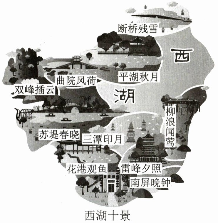 2.(1)平湖秋月 (2)双峰插云 (3)雷峰夕照 (4)柳浪闻莺(每空1分) 3. 雷峰夕照 《白蛇传》(每空1分) 4. 示例:景点名字:苏堤春晓。(1分)景点名字的由来:苏堤是北宋诗人苏东坡任杭州知州时,为了疏通西湖,利用挖出的淤泥堆积而成的,后人为了纪念苏东坡治理西湖的功绩,把它命名为苏堤。苏堤春晓,是说春天的苏堤,桃红柳绿,游人如织,十分热闹漂亮。(2分)(评分建议:答出景点名字,得1分;答出景点名字的由来,得1分;语言流畅,得1分。)