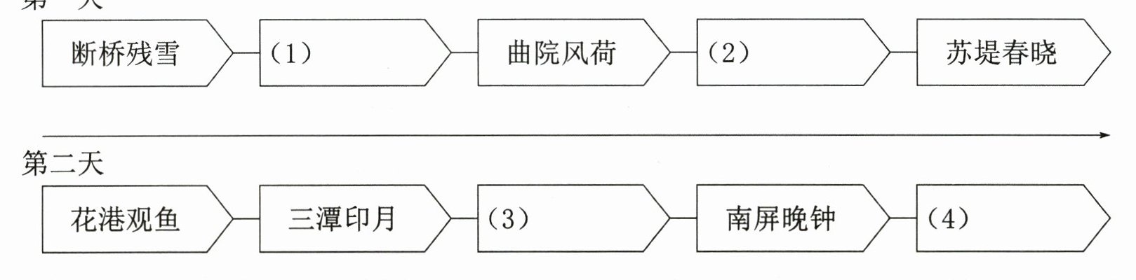 花港观鱼→三潭印月→(3)____→南屏晚钟→(4)____
