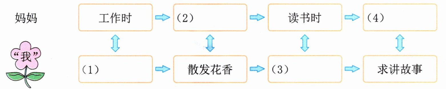 1. 思维导图阅读选文二,文中的“我”为了跟妈妈嬉戏,做了哪些事?请完成思维导图。(填序号)(4分)