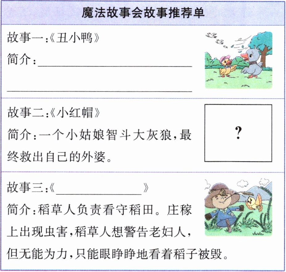 一、【故事推荐】下面是“魔法故事会”的一份故事推荐单,请你读一读,完成下面的题目。