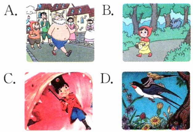 2. B 解析:B项,画的是戴着红色帽子的小姑娘,符合《小红帽》中小红帽的形象;A项是《皇帝的新装》的海报;C项是《坚定的锡兵》的海报;D项是《拇指姑娘》的海报。
