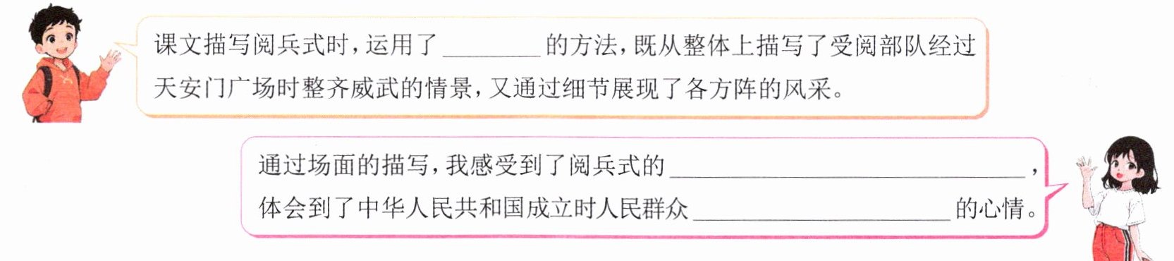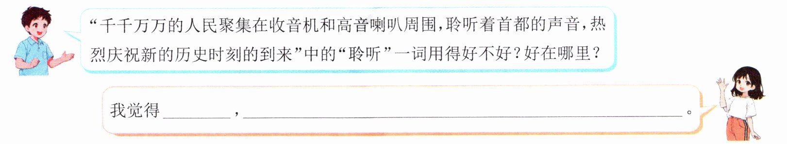 1.(1)时间 (2)领导人入场 (3)毛主席宣告 (4)阅兵仪式 (5)群众游行(每空1分) 2. 群众游行 礼花绽放 喜悦、激动(每空1分) 3. 示例:用得好(1分) “聆听”是“认真地听”的意思,形象地表现了千千万万的人民对开国大典的关注(2分)(评分建议:答出观点得1分;答出合理且充分的理由得2分。)