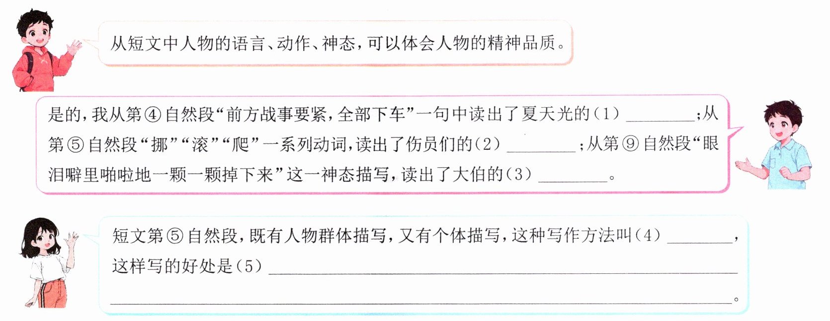 是的,我从第④自然段“前方战事要紧,全部下车”一句中读出了夏天光的(1)______;从第⑤自然段“挪”“滚”“爬”一系列动词,读出了伤员们的(2)______;从第⑨自然段“眼泪噼里啪啦地一颗一颗掉下来”这一神态描写,读出了大伯的(3)______。