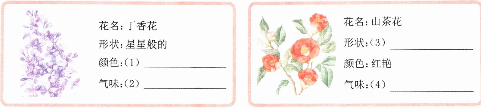 1. 花各有性。联系选文,完成丁香花和山茶花的名片。(4分)
