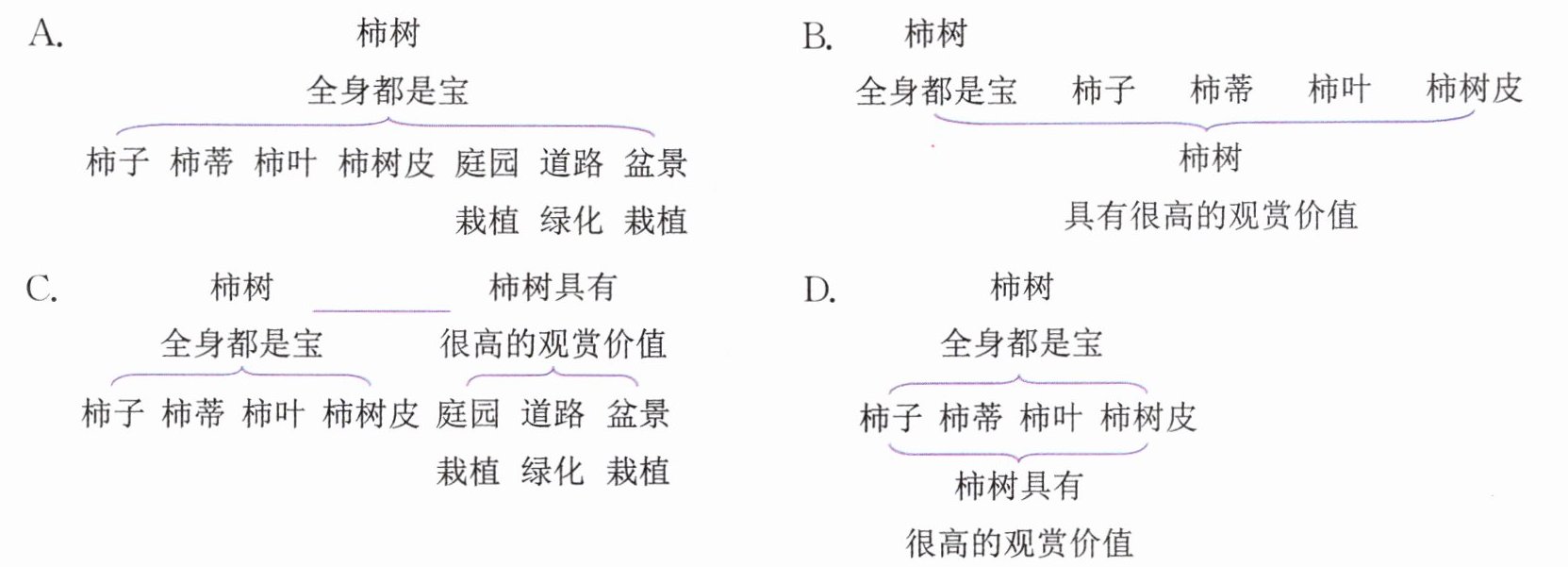 (1)柿子 葡萄(每空1分)(2)C(3分) 解析:材料三主要介绍了柿树全身都是宝,罗列了柿子、柿蒂、柿叶、柿树皮的功效;同时还介绍了柿树具有很高的观赏价值:庭园栽植、道路绿化、盆景栽植。可以从两个方面进行梳理。
