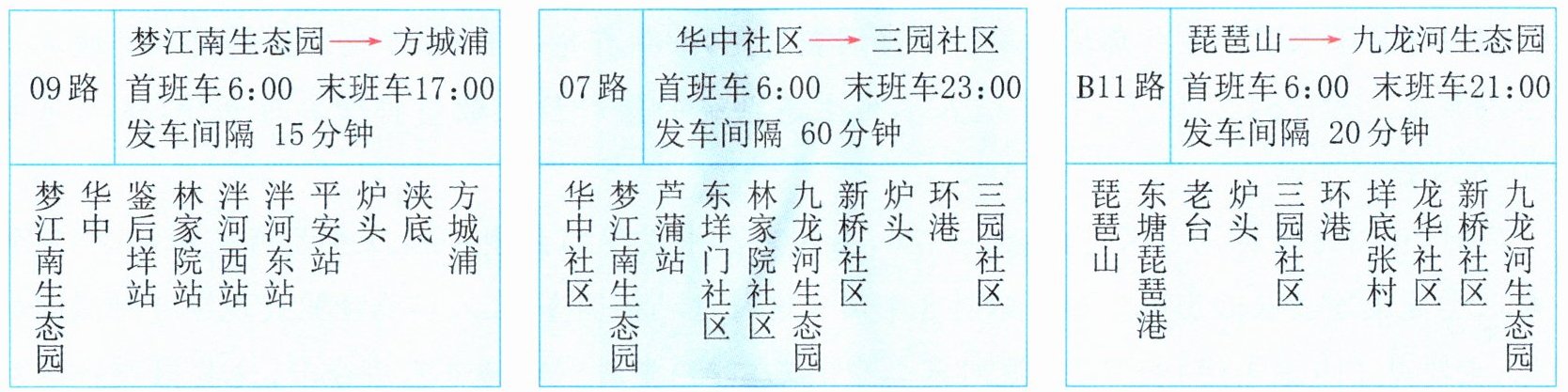 | 09路 | 梦江南生态园→方城浦首班车:6:00 末班车:17:00发车间隔 15 分钟 | 07路 | 华中社区→三园社区首班车:6:00 末班车:23:00发车间隔 60 分钟 | B11路 | 琵琶山→九龙河生态园首班车:6:00 末班车:21:00发车间隔 20 分钟 |