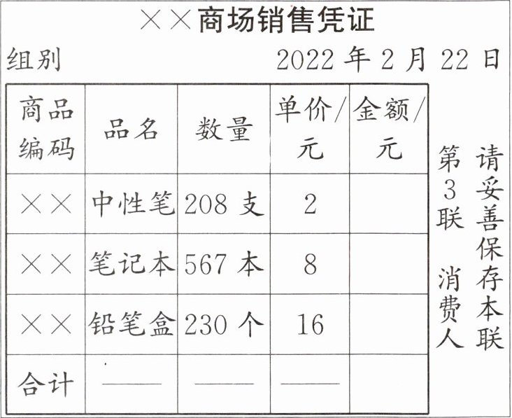 二、这是一张学校购买文具的收据,请填出相应的金额。先笔算,再用计算器验算。