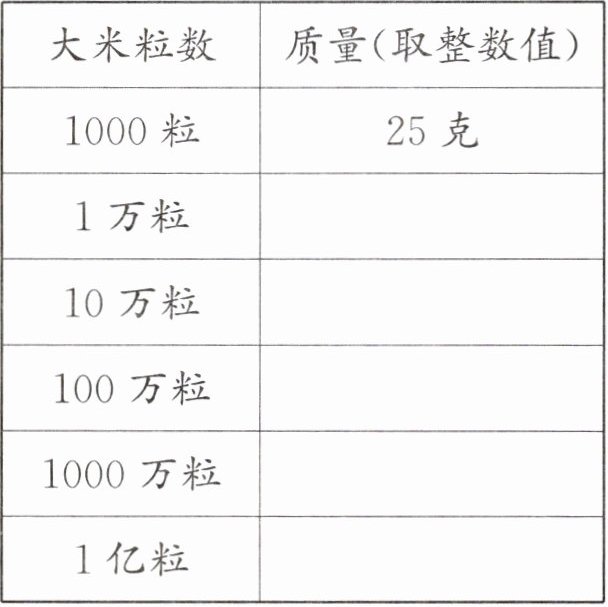 3. 如果二年级小学生平均每人体重为25千克,那么1亿粒大米的质量相当于