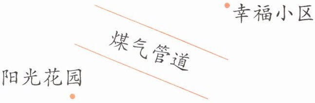 五、幸福小区和阳光花园准备安装煤气管道,为了节省安装费用,你能帮助它们设计出安装管道的路线吗?画一画。