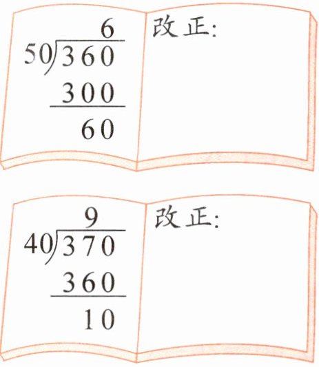 第二个算式错误,$40× 9=360$,$370-360=10$,余数为$10$,余数小于除数,但十位上的$37÷40$不够除,应在个位商$9$。
