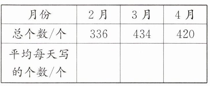 四、下表是明明写毛笔字的统计表,请完成下表。(2月按28天算)
