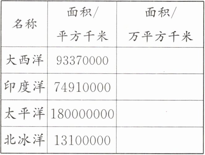 三、世界四大洋面积统计表如下,将表格填写完整。