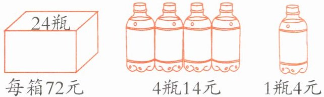 买60瓶:买2箱,再买4瓶装的3组 72×2+14×3=186(元) 买62瓶:买2箱,再买4瓶装的3组,再买2瓶4元的 72×2+14×3+4×2=194(元)