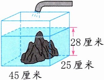 45×25×28-3500=28000(立方厘米)28000 立方厘米=28 立方分米=28 升 28÷7=4(分) 解析:要将假山石浸没在水中,水面的高度至少是 28 厘米。因为假山石占据了鱼缸内的一部分空间,所以注入的水的体积等于没有假山石时水面高 28 厘米的水的体积减去假山石的体积。用注入的水的体积除以注水的速度,就可以求出注水的时间,注意单位换算。