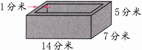 3. 如图,用混凝土浇筑一个无盖的长方体水槽(底面也浇筑),从外面量,长14分米,宽7分米,高5分米,混凝土厚1分米。