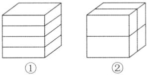 12 10 解析:24÷6=4(dm²),4=2×2,这个正方体蛋糕的棱长是2dm,将这个正方体蛋糕平均分成4份,有两种分法。分法①(如图①),表面积之和比原来增加3×2=6(个)面的面积,所以表面积之和是24+6×4=48(dm²),每个长方体的表面积是48÷4=12(dm²)。分法②(如图②),表面积之和比原来增加2×2=4(个)面的面积,所以表面积之和是24+4×4=40(dm²),每个长方体的表面积是40÷4=10(dm²)。