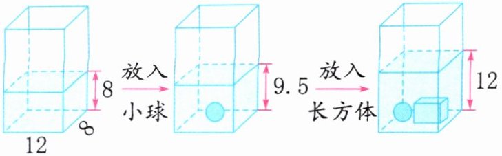 长方体 解析:由前两幅图可知,小球放入水中,水面升高9.5-8=1.5(cm)。由后两幅图可知,长方体放入水中,水面升高12-9.5=2.5(cm),放入长方体后水面升高的高度大于放入小球后水面升高的高度,所以长方体的体积大于小球的体积。