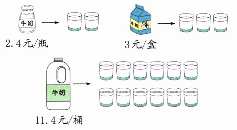 2.4÷2=1.2(元) 3÷3=1(元) 11.4÷12=0.95(元) 1.2>1>0.95 购买桶装牛奶更划算