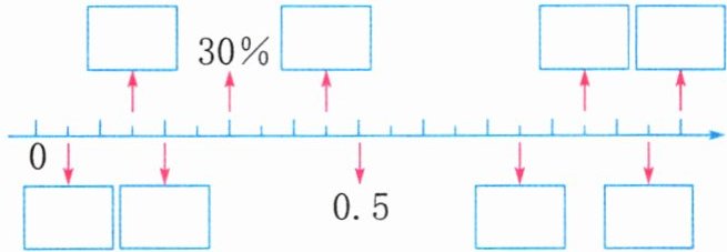1. 用小数、百分数表示下面直线上的各点。(上面一行填百分数,下面一行填小数)