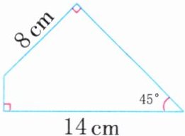 7.14×14÷2−8×8÷2=66(cm²) 解析:可以把这个图形的两条边延长,变成一个直角三角形,如图,∠A=∠E=45°,所以三角形ABE是等腰直角三角形,AB=BE=14cm。在直角三角形CDE 中,由∠E=45°,可知三角形CDE是等腰直角三角形,所以CD=ED=8cm,所求四边形的面积就是三角形ABE的面积与三角形CDE的面积的差。