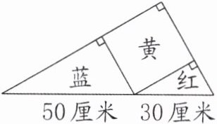 3. 如图,锐锐用一张斜边长为30厘米的红色直角三角形纸片、一张斜边长为50厘米的蓝色直角三角形纸片和一张黄色的正方形纸片恰好拼成一个直角三角形。红色、蓝色两张三角形纸片的面积之和是多少平方厘米?