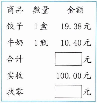 3.(生活应用)妈妈在超市购买了两种商品,请你帮她算出购买这两种商品的合计金额和找零金额。