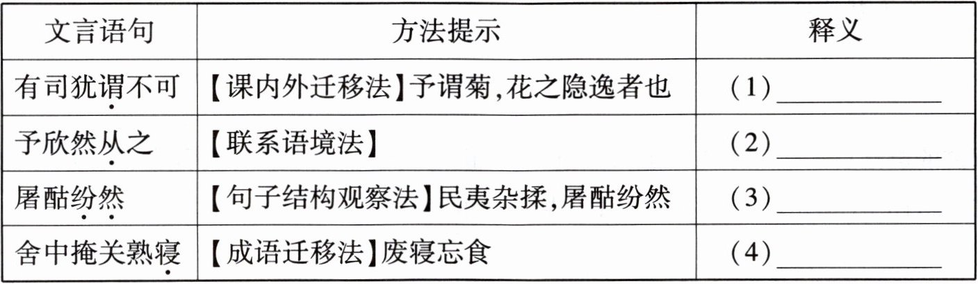 |有司犹谓不可|【课内外迁移法】予谓菊,花之隐逸者也|(1)______|