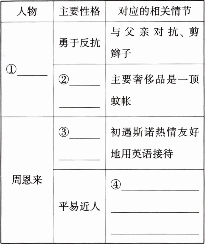| ①_____ | 勇于反抗 | 与父亲对抗、剪辫子 |