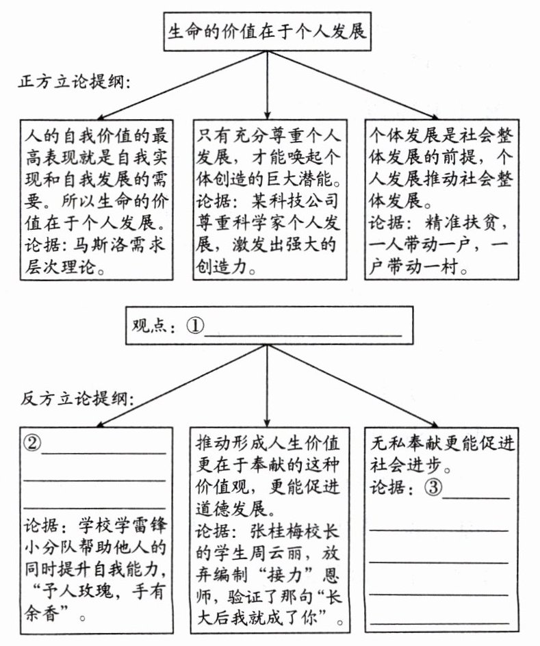 新考法 【巧辩论】(3)校辩论社团的同学就“生命的价值在于个人发展还是在于奉献社会”这一辩题展开了一场辩论赛。请你参照示例帮助反方同学完善立论提纲。(4 分)