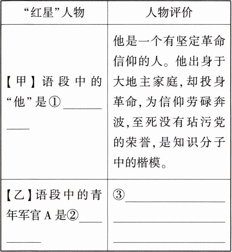 |【甲】语段中的“他”是①______|他是一个有坚定革命信仰的人。他出身于大地主家庭,却投身革命,为信仰劳碌奔波,至死没有玷污党的荣誉,是知识分子中的楷模。|