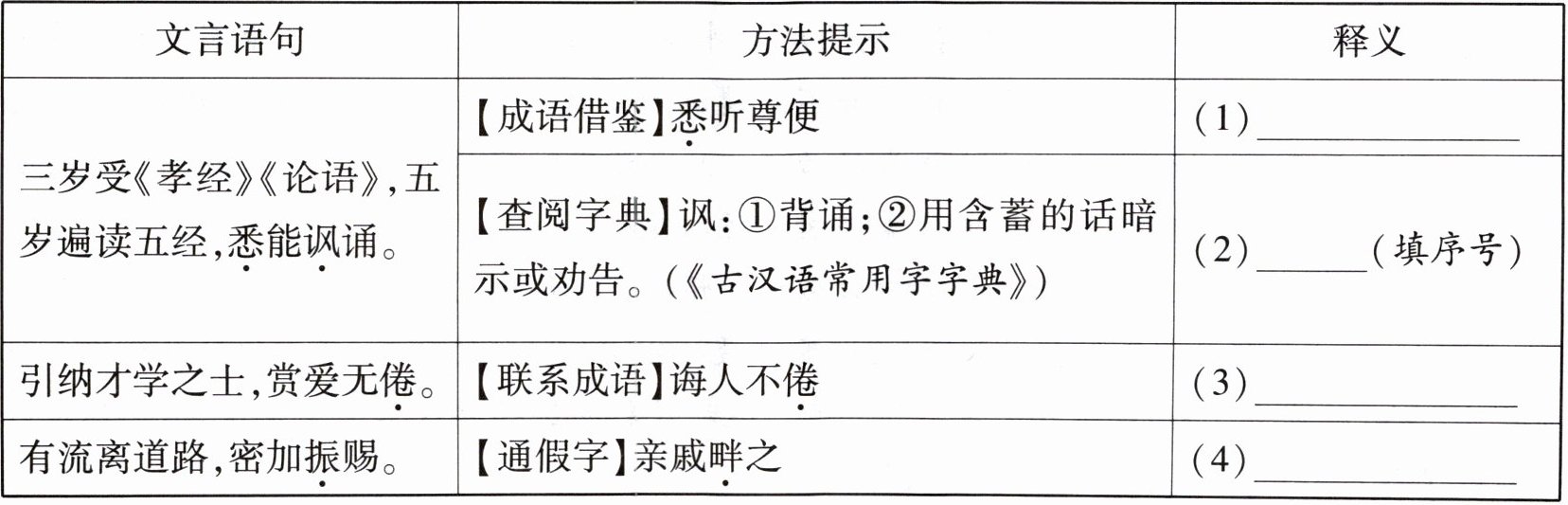 |引纳才学之士,赏爱无倦。|【联系成语】诲人不倦|(3)______|