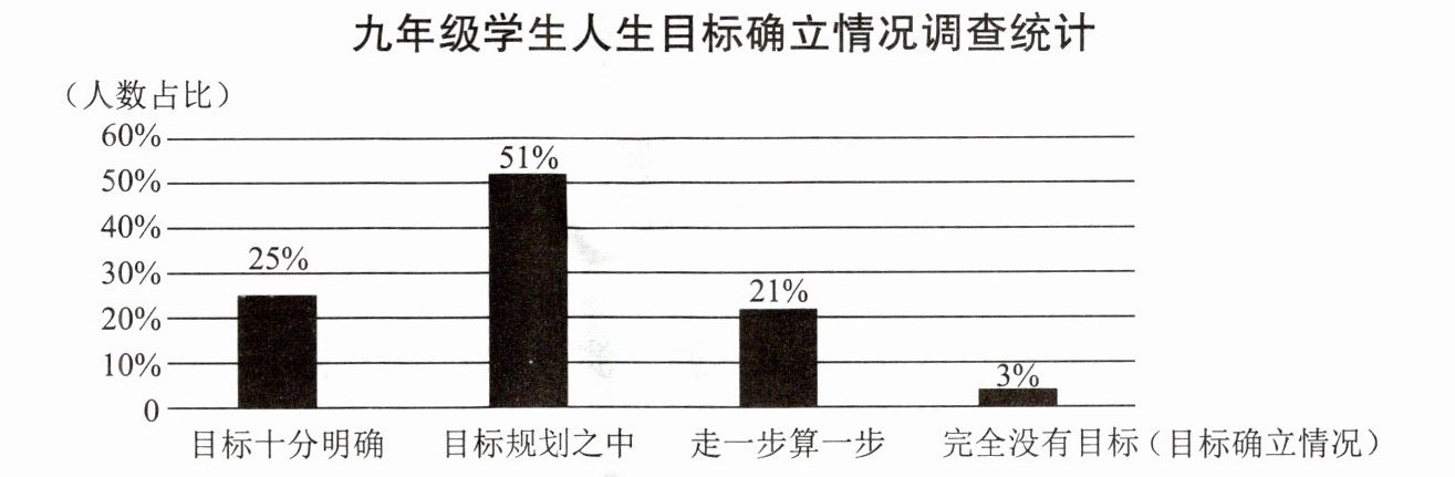 (3)(示例)结论:九年级有半数以上的学生有明确的人生目标或目标正在规划之中。建议:学校开设与人生规划有关的课程,邀请英模人物来学校开展有关人生目标规划的讲座。