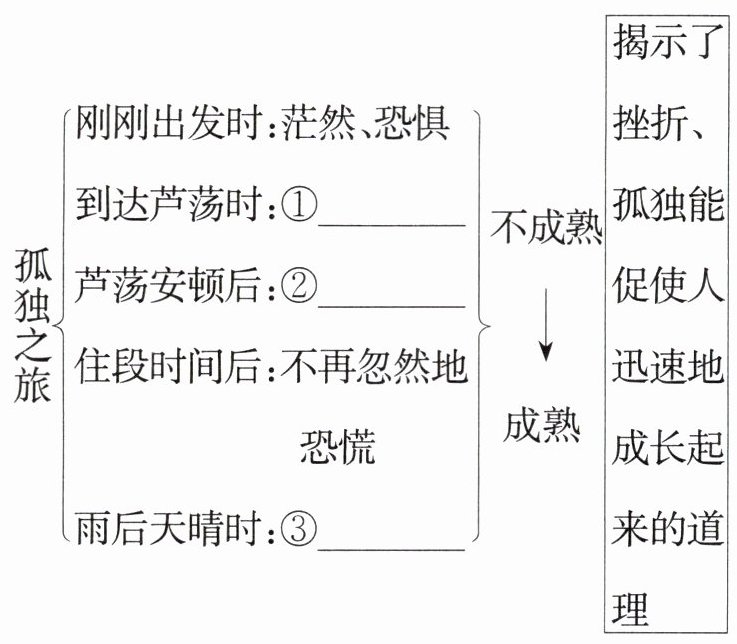 ①胆怯、慌张 ②孤独、单调 ③坚强起来