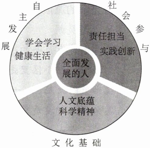 (1)中国学生发展核心素养以培养全面发展的人为核心,分为文化基础、自主发展、社会参与三个方面,综合表现为人文底蕴、科学精神、学会学习、健康生活、责任担当、实践创新六大要素,各要素互联互补,整体发挥作用。