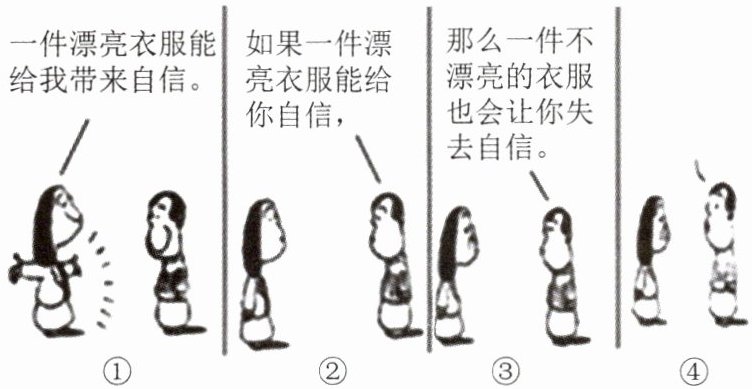 (2)[欣赏漫画]请你认真品味漫画①~③中的人物对话,针对如何建立自信为漫画④设计一句富含哲理的话。(2分)