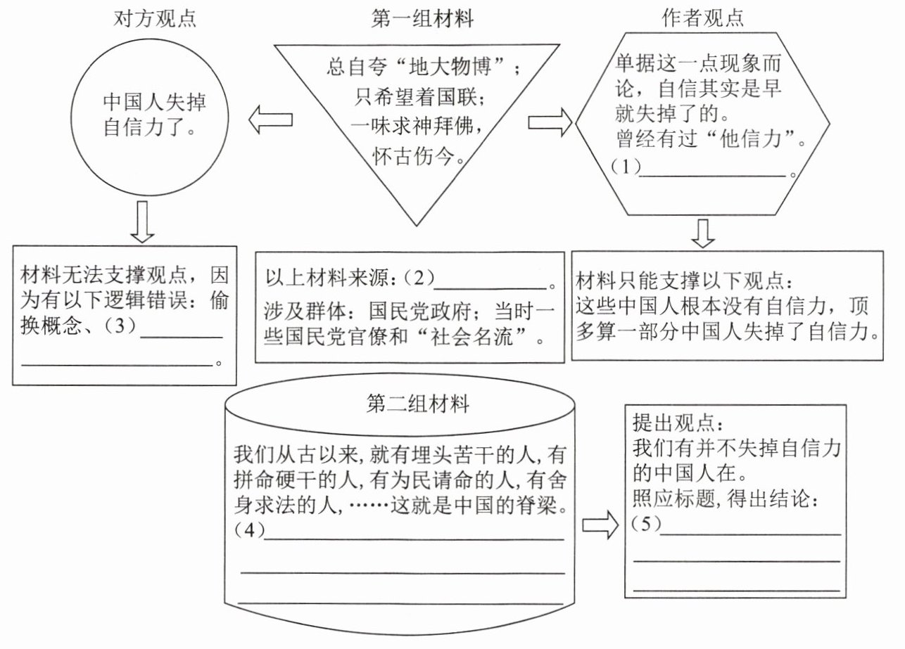 (3)先列出自己的观点——我们有并不失掉自信力的中国人在;再摆出事实——几类中国的脊梁;然后讲道理——说全体中国人失掉自信力是污蔑;最后得出结论——自信力的有无,状元宰相的文章不足为据,要自己去看地底下(每空2分)