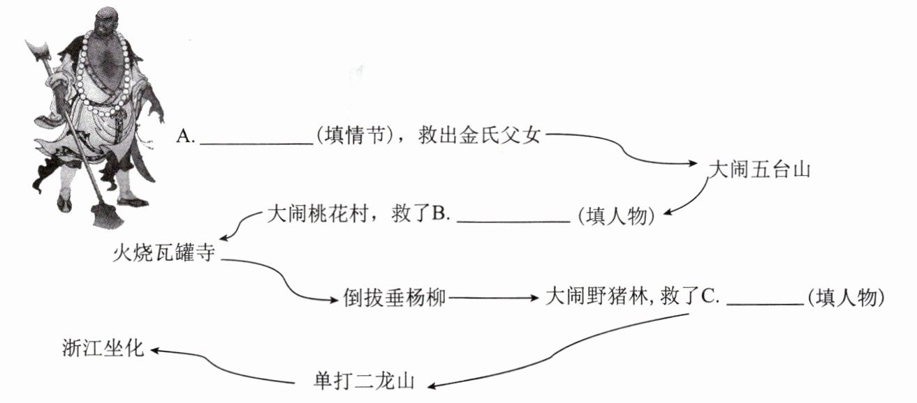 2. 小语同学在整理《水浒传》人物卡片时,发现鲁达不是在救人,就是在救人的路上。他画出了下面这幅思维导图。