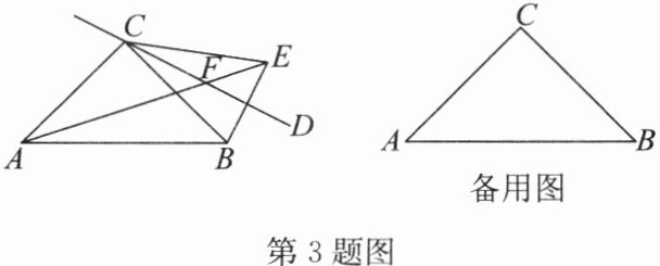 3. 如图,$ △ABC $ 中,$ AC = BC = 4 $,$ ∠ACB = 90° $,过点 $ C $ 任作一条直线 $ CD $,将线段 $ BC $ 沿直线 $ CD $ 翻折得线段 $ CE $,直线 $ AE $ 交直线 $ CD $ 于点 $ F $。