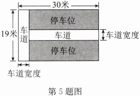5. (2024·东城区模拟)如图是某停车场的平面示意图,停车场外围的长为 30 米,宽为 19 米,若停车位总占地面积为 390 平方米,停车场内车道的宽都相等,求车道的宽.