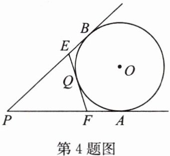 4. 如图,PA,PB 是$\odot O$的切线,切点分别是 A,B,点 Q 为$\overset{\frown }{AB}$上一点,过点 Q 作$\odot O$的切线,交 PA,PB 于点 E,F,已知$PA= 10cm$,求$\triangle PEF$的周长.