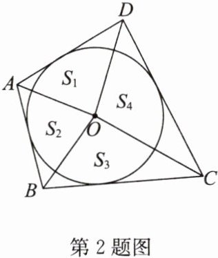 2. 如图,圆 O 是四边形 ABCD 的内切圆,连接 AO,BO,CO,DO,记△AOD,△AOB,△COB,△DOC 的面积分别为$ S_1,S_2,S_3,S_4,$则$ S_1,S_2,S_3,S_4 $的数量关系为______。