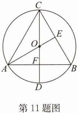 11. 如图,$CD为\odot O$的直径,$CD\perp AB$,垂足为$F$,直线$AO\perp BC$,垂足为$E$,连接$AC$。