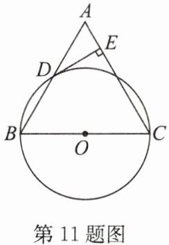 11.如图,在$\triangle ABC$中,$BC= AC= 6$,以BC为直径的$\odot O$与边AB相交于点D,$DE⊥AC$,垂足为E.