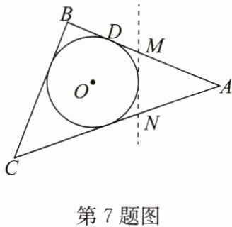 7.(宿城区期中)如图,$△ABC$是一张周长为 17 cm 的三角形纸片,$BC= 5cm,\odot O$是它的内切圆.小明准备用剪刀在$\odot O的右侧沿着与\odot O$相切的任意一条直线 MN 剪下$△AMN$,则剪下的三角形的周长为 (