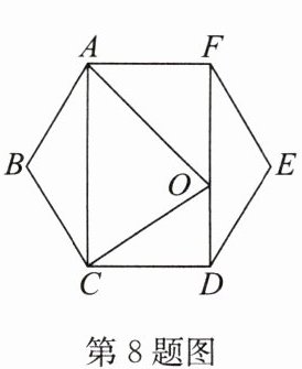 8. (2023·无锡期中)如图,点O是正六边形ABCDEF对角线DF上的一点,且$S_{\triangle AOC}= 8$,则正六边形ABCDEF的面积为 (